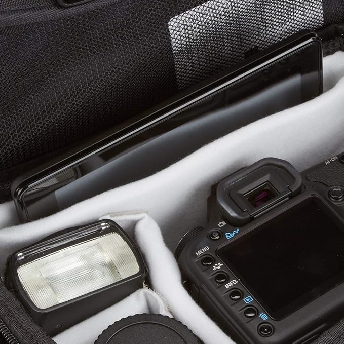 - Bag for storing, carrying, and protecting camera equipment; holds 1 DSLR body and 3 lenses