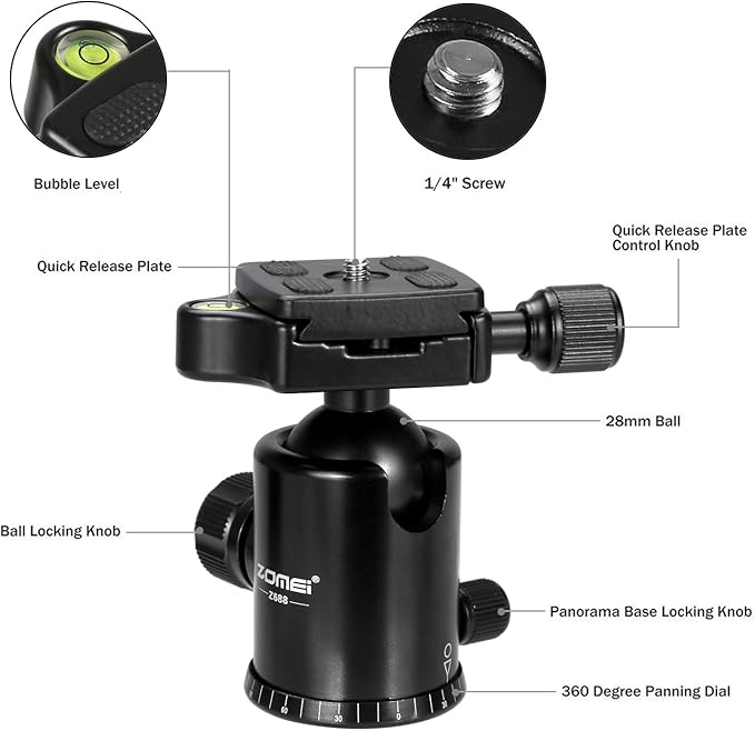 - Professional: Universal ball head design with 2 locks, one for panning and the other offering the different damping effect depends on the weight of your camera.