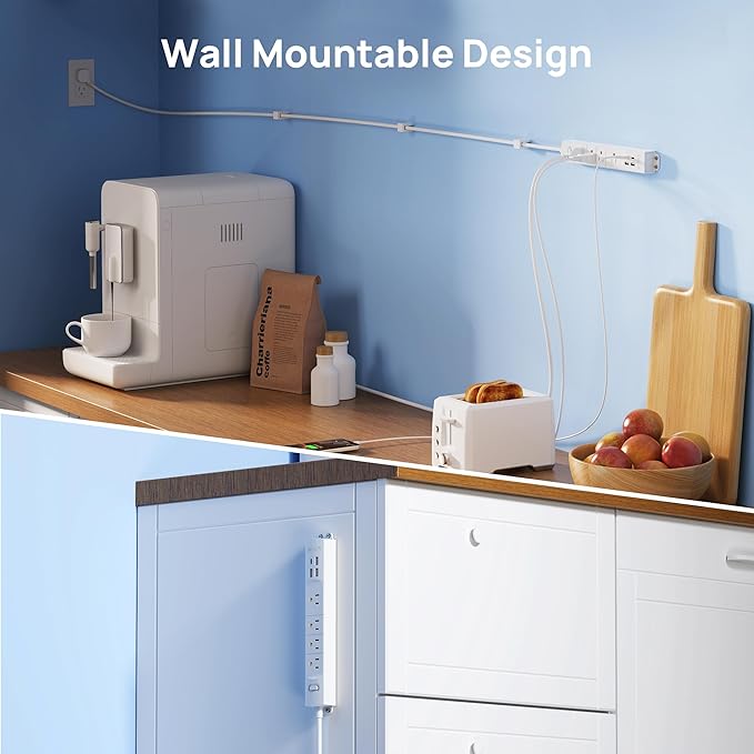 - Ultra Flat Plug & Wall Mountable: The low-profile right angled flat plug design is great for stashing under or behind furniture. Four screw-mounting tabs allow this wall mount flat plug power strip to be securely installed on workbenches, behind the tv, garage, bedside, under counters/desks/cabinets, and dressers.