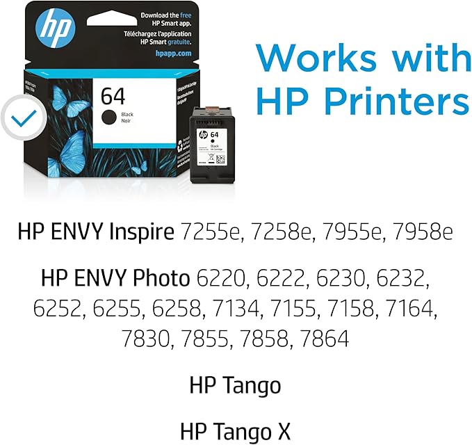 HP 64 Black Ink Cartridge for HP Printers | Works with Printer Series: ENVY Inspire 7950e; ENVY Photo 6200, 7100, 7800; Tango | Eligible for Instant Ink | N9J90AN