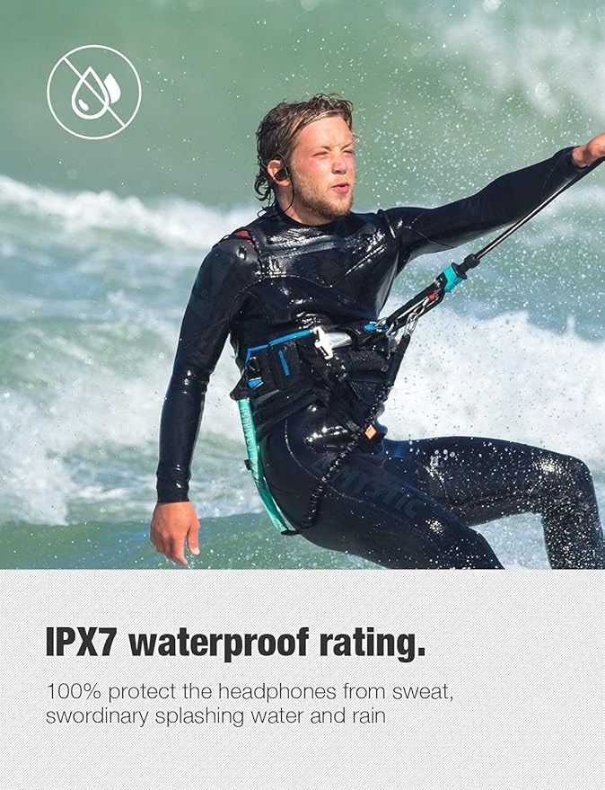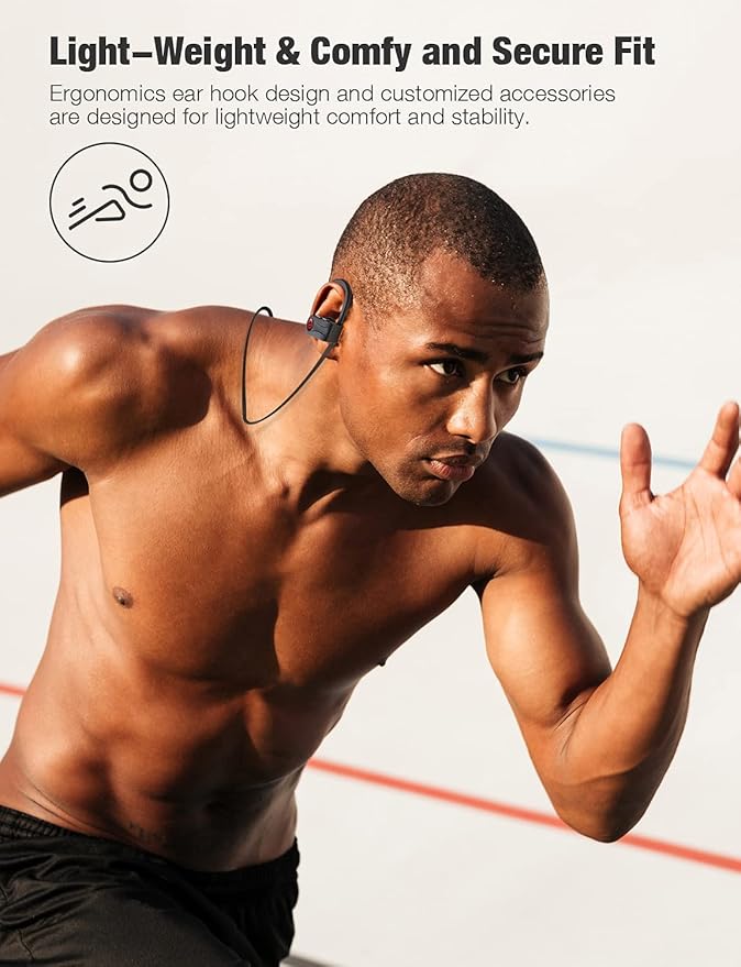 - IPX7 Waterproof Rating: With ergonomic design and silicone ear hooks, wireless headphones secure stay on your ears, feel great to wear and will never fall out. Upgraded Waterproof Rating, 100% prevents ordinary splashing water and rain.