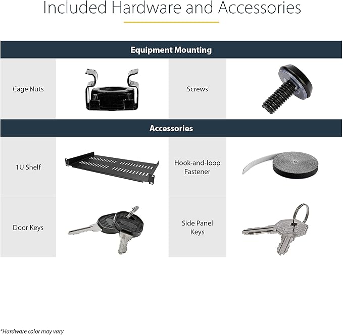 - FULLY ASSEMBLED: SWINGING NETWORK CABINET SHIPS FULLY ASSEMBLED WITH ALL OF THE RACK SCREWS AND CAGE NUTS REQUIRED TO MOUNT YOUR EQUIPMENT; INCLUDES A SHELF AND A ROLL OF HOOK-AND-LOOP FASTENER; WALL-MOUNT EQUIPMENT CABINET IS EIA/ECA-310-E COMPLIANT FULLY ASSEMBLED: Swinging network cabinet ships fully assembled with all of the rack screws and cage nuts required to mount your equipment; Includes a shelf and a roll of hook-and-loop fastener; Wall-mount equipment cabinet is EIA/ECA-310-E Compliant