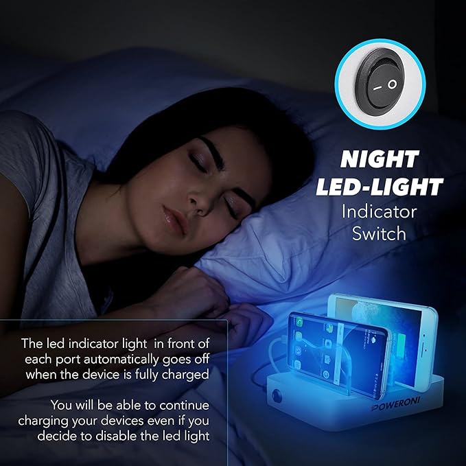 - Poweroni 4 Port USB Charger: The Poweroni 4 port USB charger has built-in status LED indicators that stop charging automatically once devices are fully charged, protecting them from overcharging