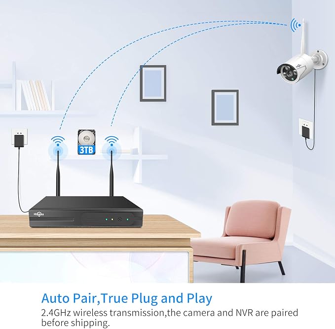 - 【Easy setup, Need Plug Power Supply】Wireless video security system is easy to setup and DIY installation. Wireless means camera and NVR is wireless connection, but they still need work with power plug. True Plug and Play. 1) Connect the NVR and cameras with power adapter. 2) Connect the mouse to NVR, connect PC/TV monitor to NVR with a VGA/HDMI Cable. The Video will show up on TV or display.