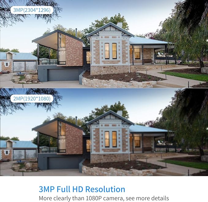 - 【Stunning 2K Ultra-HD video, one Way Audio】 3.0MP presents 2304*1296 Mega Pixels about 1.5 times clearer than 1080P. Camera with 3 array Infrared LED allows you to see up to 65ft night vision even in darkness. Employing IP66 Waterproof metal material housing, cameras can be used indoor and outdoor. Outdoor security camera system also allows you to see and listen to people on your property remotely.