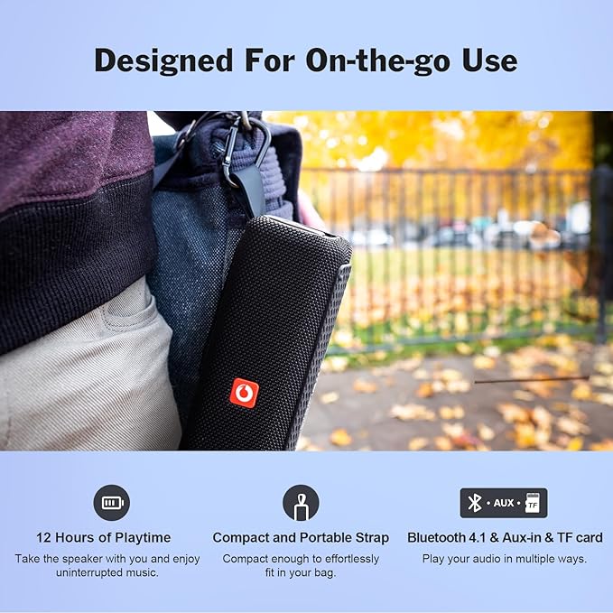 - IPX6 Waterproof, Dustproof, Crashproof: The waterproof Bluetooth speaker is made with sturdy fabric that protects it from water, sand, and dust. The rugged silicone housing and port cover make the speaker shock-resistant and rugged.