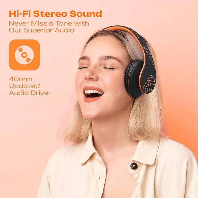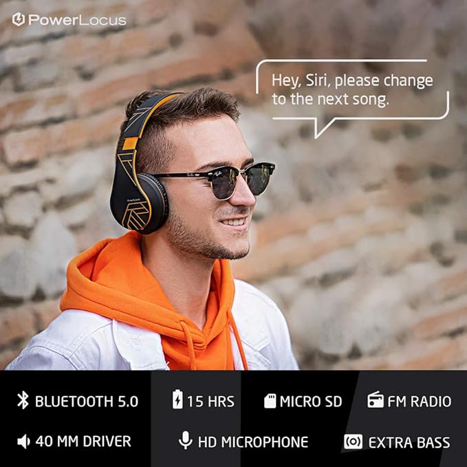 PowerLocus Bluetooth Over-Ear Headphones, Wireless Stereo Foldable Headphones Wireless and Wired Headsets with Built-in Mic, Micro SD/TF, FM for iPhone/Samsung/iPad/PC (Black/Orange)