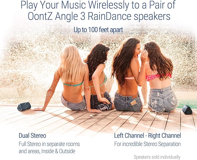 - WIRELESS STEREO PAIRING - Connect two Angle 3 RainDance wireless speakers with Bluetooth 4.2 for incredible left and right stereo. Play 2 of these waterproof Bluetooth speakers in different areas up to 100 unobstructed feet apart (note: sold separately).