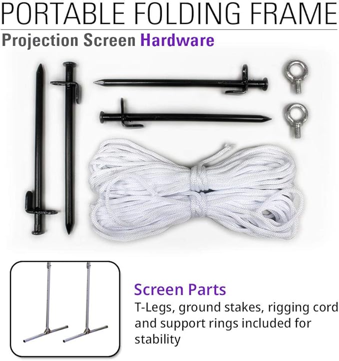 - 【WHAT YOU WILL GET】:Adjustable Height Setting Allow for a Versatile Indoor Outdoor projection screen. Kit Includes: Single-Piece Aluminum Frame with Detachable Legs, Screen Material, Carrying Bag, Ground Stakes, Rigging Cord, and Support Rigs.
