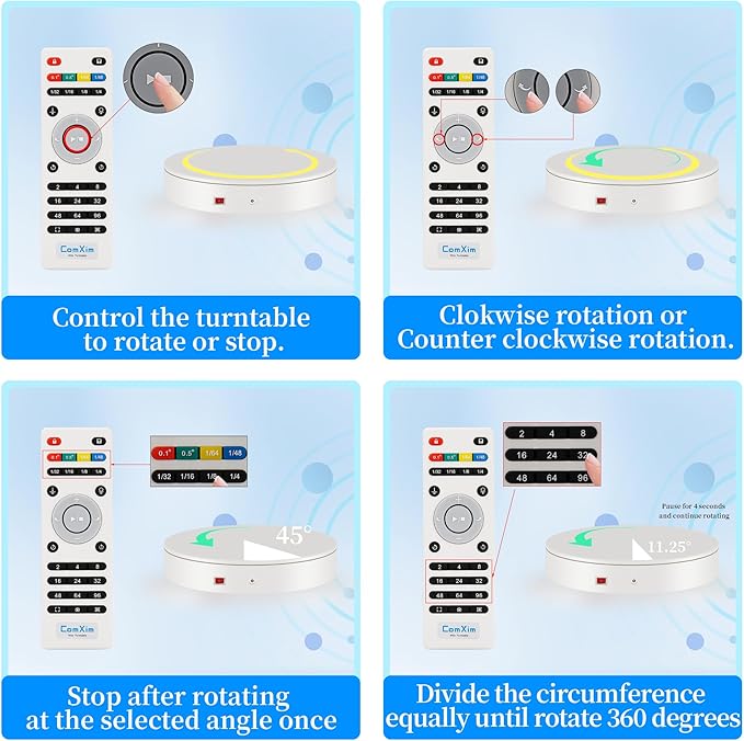 - ComXim 360 degree professional rotating platform, which can be used for product display, painting art, product photography and 3D scanning. Package includes turntable, power supply, remote control (batteries not included). This photography turntable features a metal-nylon hybrid gear reduction box design, which further reduces operational noise. Additionally, This electric turntable utilizes software-based variable frequency speed regulation technology, extending its speed adjustment range to as many as 25 gears.