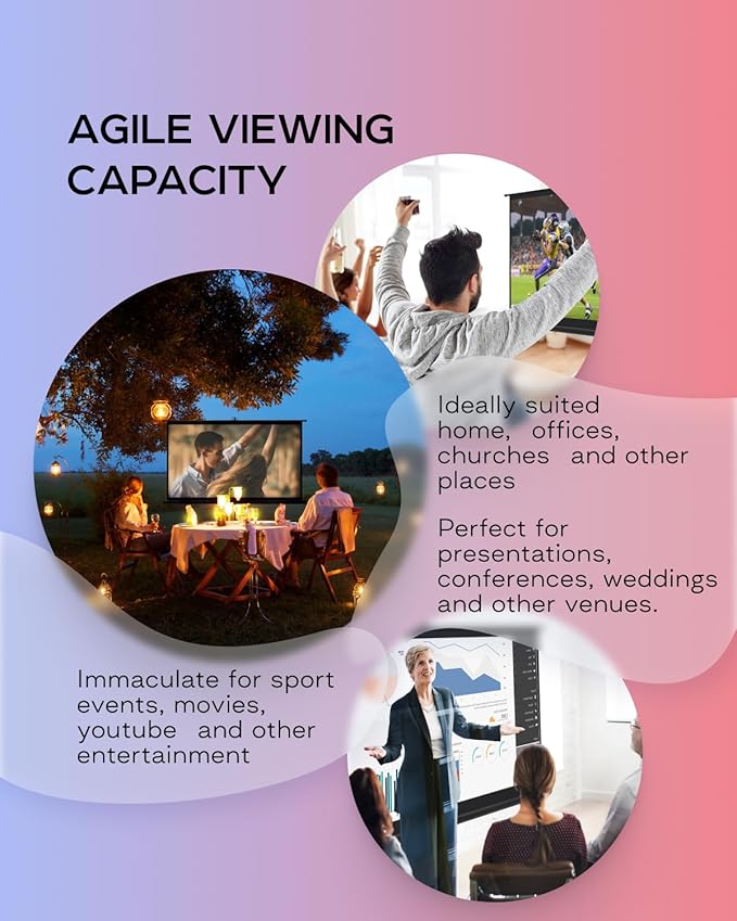 - Viewing capacity enables usage in any places: home, school, office, church, classroom, backyard; on any venues: presentations, conferences, weddings, parties; for any entertainments: sport events, movies, TV shows, video games, youtube.