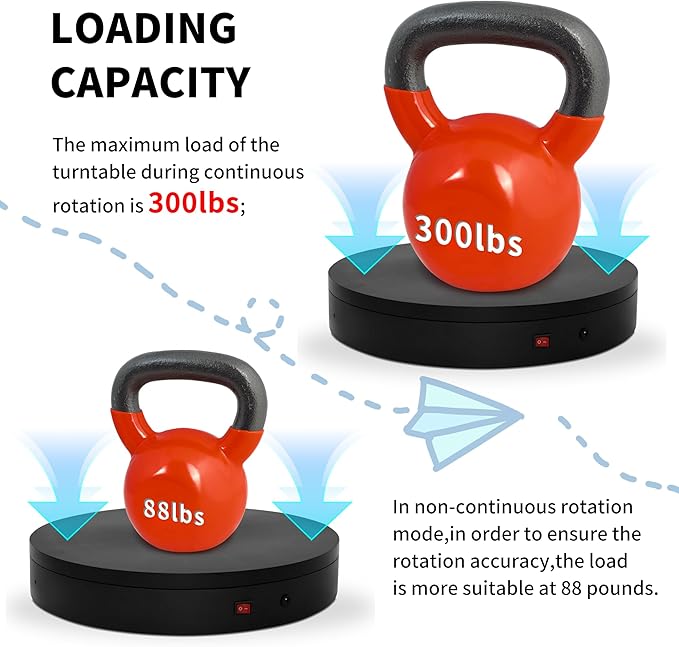 - This motorized turntable has a diameter of 12.6 inches.,the load-bearing range of the display rotating platform is between 88-300pounds. In continuous rotation mode, the load-bearing capacity can reach 300 pounds. If rotated by angle, motorized electric turntable involves rotation accuracy, and the load-bearing capacity is 88 pounds. Remote control speed: the electric motorized turntable speed range is 27-72sec/rev.(the maximum speed is 27 seconds per circle & the minimum speed is 72 seconds per circle). Precision manufacturing ensures smooth, quiet operation with minimal vibration and disturbance.