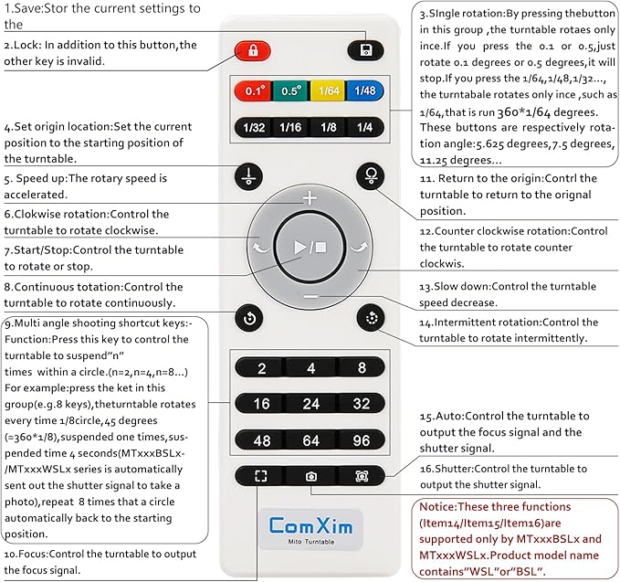 - ComXim 360 degree professional rotating platform, which can be used for product display, painting art, product photography and 3D scanning. Package includes display turntable, power supply, remote control (batteries not included). This photography turntable features a metal-nylon hybrid gear reduction box design, which further reduces operational noise. Additionally, This electric turntable utilizes software-based variable frequency speed regulation technology, extending its speed adjustment range to as many as 25 gears.