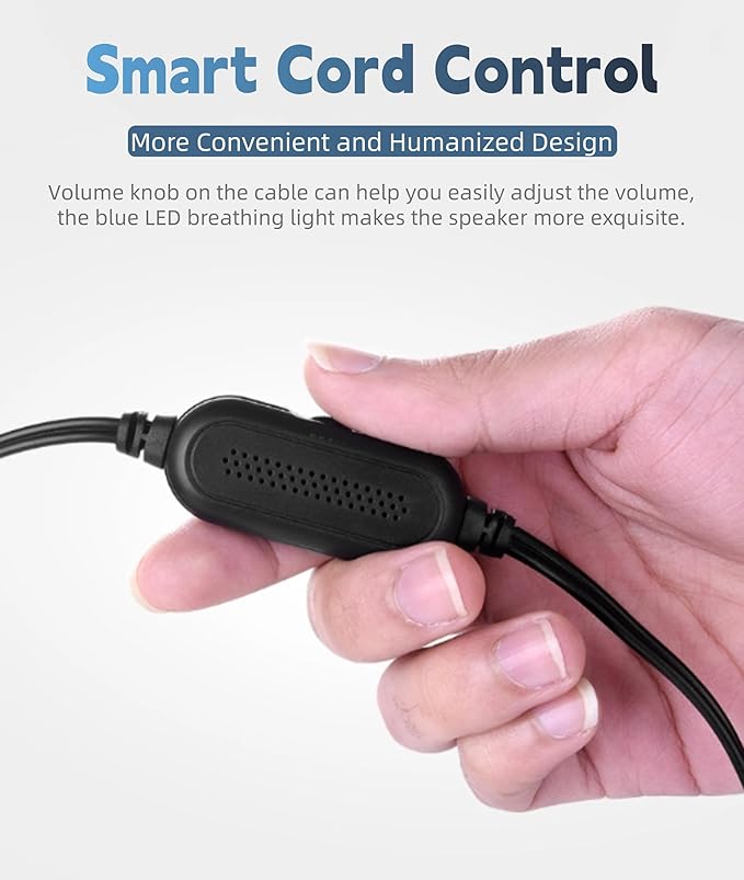 - Volume knob on the cable can help you easily adjust the volume, the blue LED breathing light makes the speaker more exquisite.