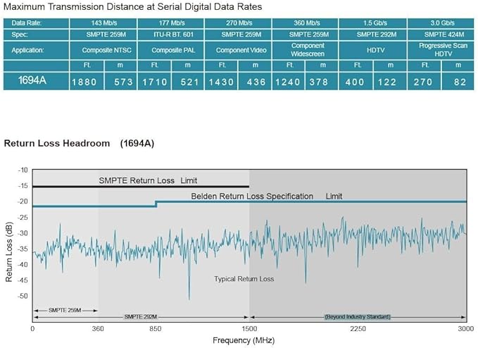 - Specifications: Both ends BNC male (plug) | Connector: Gold plated | Impedance: 75 Ohm | Cable Type: Belden 1694A;18 AWG|Standard Definition SD-SDI (270 Mbps, ST 259) HD standard HD-SDI (1.483 Gbps, ST 292)3G-SDI (2.97 Gbps, ST 424) 6G-SDI (5.94 Gbps, ST 2081) 12G-SDI (11.88 Gbps, ST 2082)