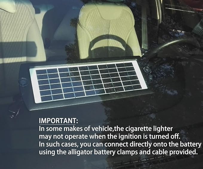 - [Pug And Play,Simple And Very Easy to Use]--This solar charger will NOT overcharge your battery! The solar panel mounts easily to the windshield or dash and conveniently plugs into your car's 12 volt cigarette lighter! If you need a Quick Connect And Disconnect Extension Cable For this solar charger,Please search the ASIN:B073158Q24.
