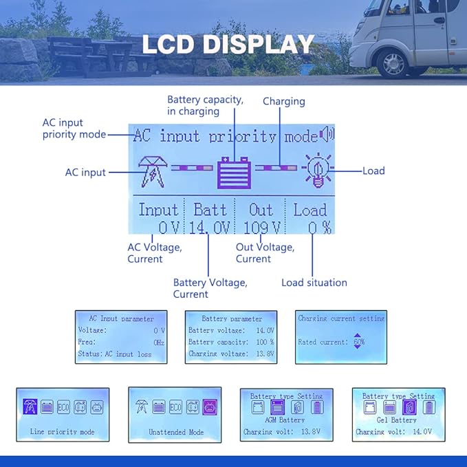 - Five working mode : AC priority mode / Battery priority mode / Generator mode / ECO mode / Unattended mode. When AC input is present, the battery will be charged first, and the inverter will transfer the input AC to power the load. When you choose battery priority, the inverter will invert from battery dc to ac output . Battery priority mode & Unattended mode have Low volt restore setting and Low volt protect setting.