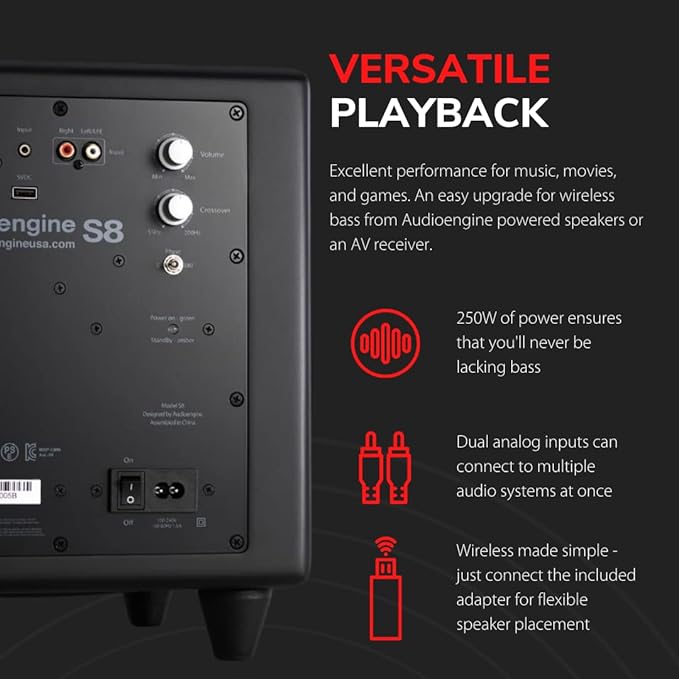 - WHAT’S INCLUDED: Audioengine S8 Powered Subwoofer, W3 Wireless sender/receiver, RCA audio cable, 2 3.5mm mini-jack audio cables, RCA adapter Y cable, AC power cord, W3 sender 5V power cord, Microfiber cloth bag, quickstart guide