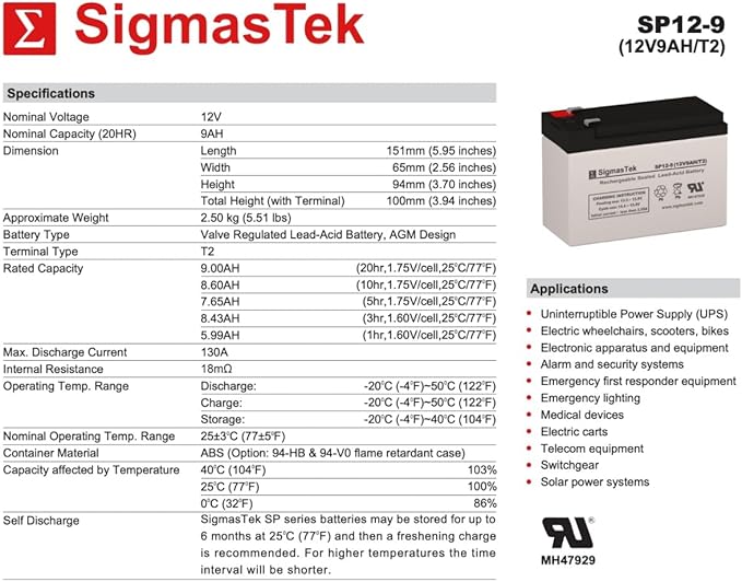 - BATTERY TYPE - 12 Volt 9 Amp Hour F2, SigmasTek SP12-9 (T2) Rechargeable Sealed Lead Acid (SLA), Absorbent Glass Mat (AGM) Battery with T2 / F2 Terminals.