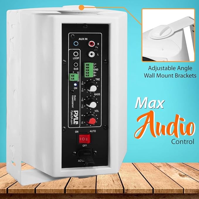 - Rear control center: the speakers with Bluetooth feature rear panel controls W/ Rotary volume, bass & treble adjustments. Additional features include adjustable bracket angle, unique standby/auto power on W/ audio signal input, Daisy chain ability