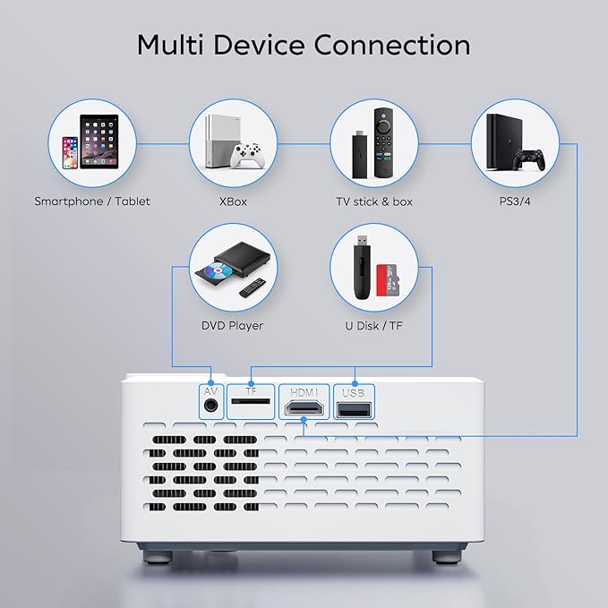 - 【Portable Mobile Home Cinema】The V08 movie projector provides a minimal display area of 32” to a maximum 220” image with projection distances between 1.5-6m. Aspect Ratio: 4:3/16:9, Contrast Ratio: 5000:1, Lamp lifetime: 60,000 hours. It enables excellent playback of movies, TV shows, video games and can be set up conveniently. Our newly improved 2023 uniform illumination method provides the optimal visual experience, ensuring no dark areas are present along the edges of the displayed image.