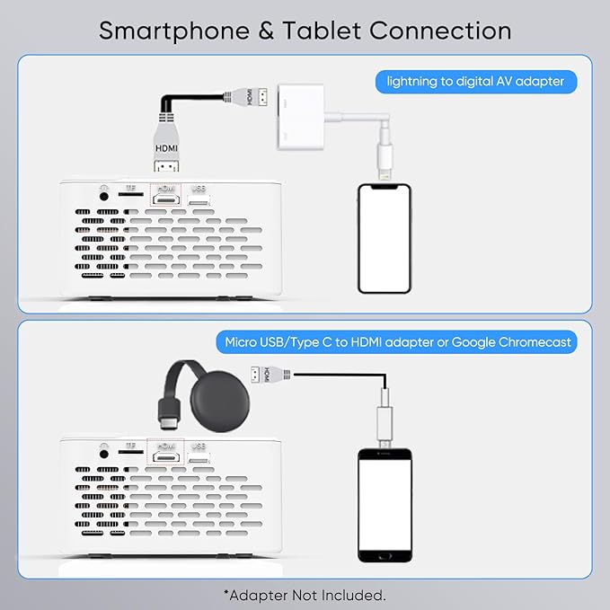 - 【Compatibility Instruction】 This mini projector also can be compatible with phones and tablets, if you need to connect the phone or tablet, please prepare a HDMI adapter cable. For ios device, you need to use the official Lightning to HDMI adapter to connect your phone with the projector. (HDMI adapter is not included.) For Android device, if your phone supports MHL, then you can use the micro usb/type-c to HDMI cable to connect your phone with the projector. (HDMI cable is not included.) If your phone does not support MHL, you should prepare a Chrome-cast to connect your phone with the projector.