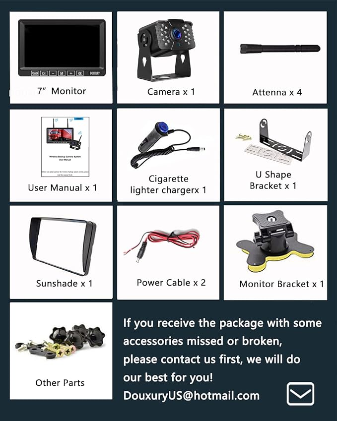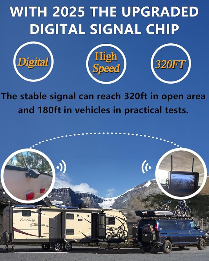 - Upgraded Wireless Backup Camera: With unique dual antenna design and the latest digital signal chip, the wireless backup camera can send 1080P videos to the display via the stronger signal. The signal can reach 320ft in open area and 180ft in vehicles