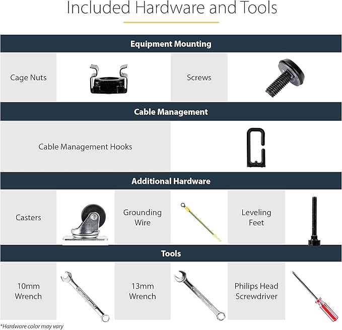 - HARDWARE INCLUDED: Rolling computer/data rack includes cage nuts and screws to mount equipment, easy to read Units (U) and depth adjustment markings, cable management hooks for organization, and required assembly tools