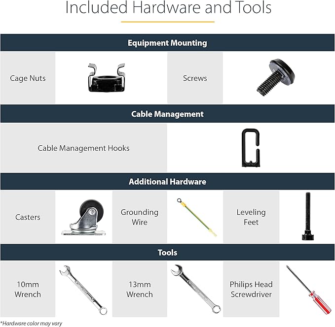- HARDWARE INCLUDED: Rolling computer/data rack includes cage nuts and screws to mount equipment, easy to read Units (U) and depth adjustment markings, cable management hooks for organization, and required assembly tools