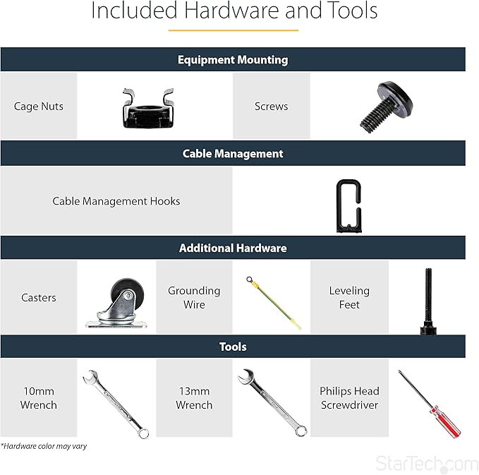 - HARDWARE INCLUDED: Rolling computer/data rack includes cage nuts and screws to mount equipment, easy to read Units (U) and depth adjustment markings, cable management hooks for organization, and required assembly tools
