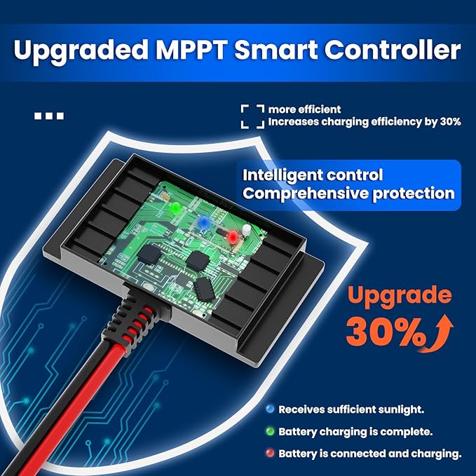 - 2024 MPPT Controller: This 12V solar trickle charger increases efficiency by 30% without power consumption. It automatically operates during daylight and extends battery life with full protection: short circuit, lightning, under-voltage, and overcharge