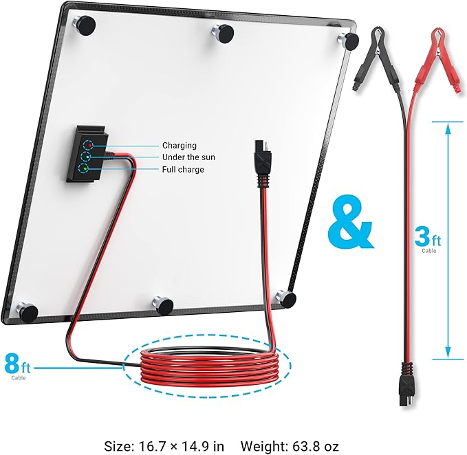 - Solar Charger and Maintainer: Safely charge and maintain 12V batteries to extend their life, including Wet, Gel, MF, EFB, and AGM. Suitable for cars, LiFePO₄, lithium-ion batteries, motorcycles, boats, tractors, RVs, Powersports, and trucks