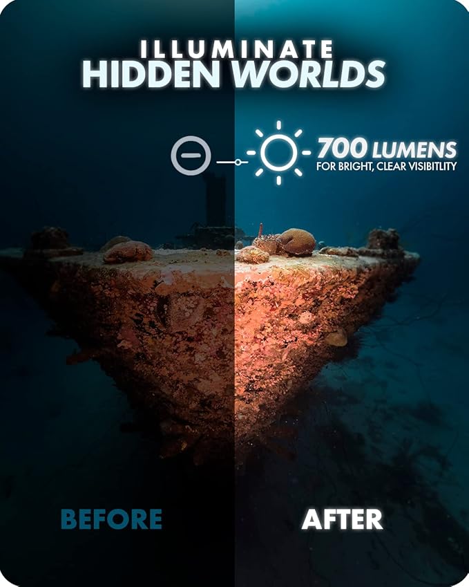 - BUNDLED WATERPROOF LED LIGHTS - Powerful 700 lumen lights that work up to 130 feet underwater. Long-lasting, rechargeable batteries come with USB power adapters