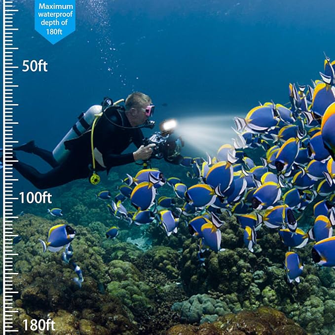 - 180ft Waterproof(55m): Suptig underwater lights waterproof to 180ft(55m), You can shoot the photos and videos you want at the bottom of the sea to bring you the perfect visual effect. Even in heavy rains it will not affect the work of Suptig dive lights.