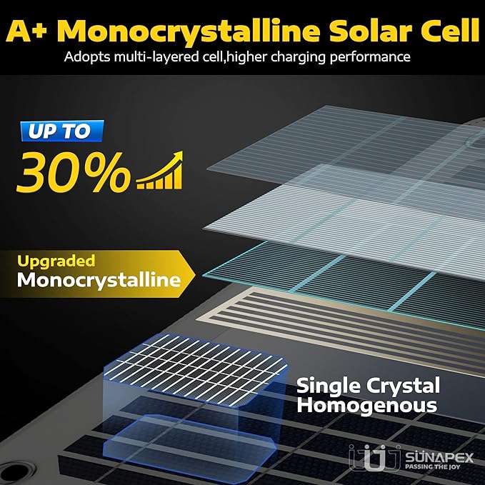 - High-efficiency Solar Panel: Our solar panel features monocrystalline cells. Compared to other polycrystalline and amorphous solar panels of the same size, our monocrystalline solar panel charges faster