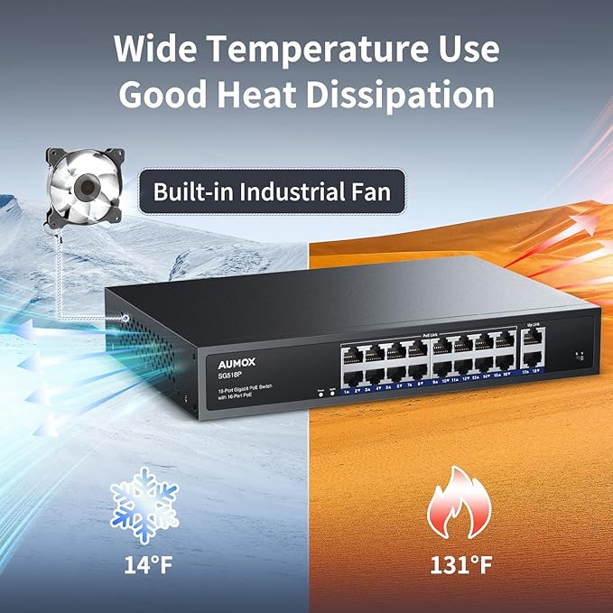 - 【Connect all your devices with gigabit switch】: Aumox gigabit PoE ethernet switch offers 18*10/100/1000 Mbps Base-TX RJ45 ports, including 16 PoE ports which automatically identifies and powers PoE devices. Built-in power supply makes adapter no more needed, easier to use