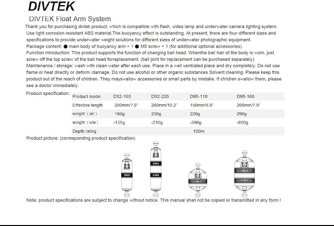 - 🐟 Buoyancy compensator devices for divers : The DIVTEK Float Arm D95-160 is the perfect accessory for enhancing buoyancy during scuba diving. It provides superior buoyancy for your camera, flashlight, underwater housing tray, or buoyancy compensation device, allowing you to focus on your dive without worrying about your equipment.