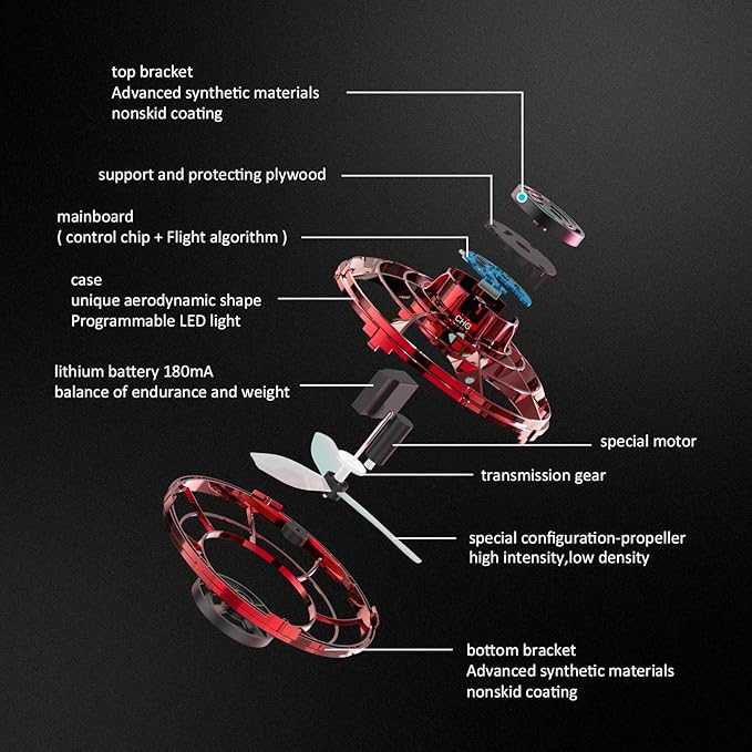 - 【Safe and Anti-drop】: This light up UFO drone toy made of high-quality non-toxic and soft ABS material, and the closed wheel design will effectively protect hands when spinning, keeps the drone safe from damages.It will stop automatically when it hit the furniture or any other stuffs.