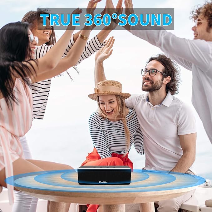 - ♩♪♫【BLUETOOTH SPEAKER WITH TRUE 360° STEREO SOUND&AMAZING BASS SOUND】MusiBaby bluetooth speakers with stereo sound&full bass,the speakers bluetooth wireless deliver immersive sound with rich bass,mids and highs,dynamic sound.This bluetooth speaker without any breaking sound even at maximum volume.You will like MusiBaby’s bluetooth speaker true 360°Stereo Sound portable bluetooth speakers.This portable speaker bluetooth is equipped with two powerful loud speakers.It would be a great portable speakers bluetooth wireless loud for home or party.You can enjoy booming sound effects at indoor or outdoor activities