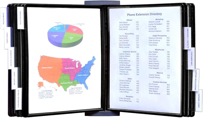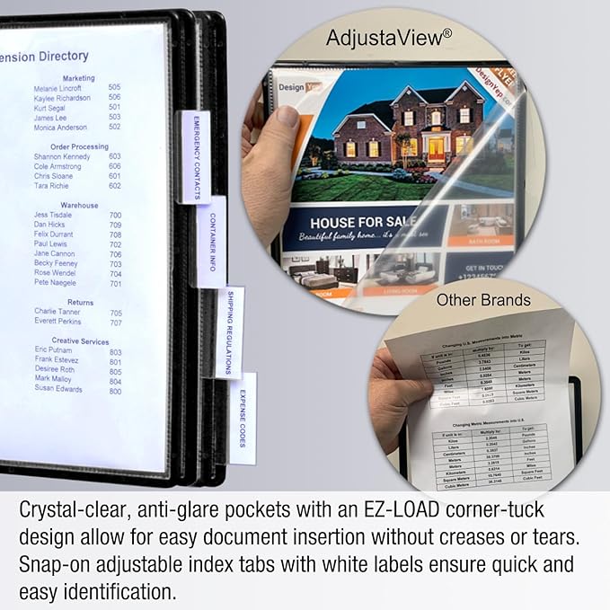 - EASY LOAD POCKETS & TABS - Crystal-clear protective, easy-load, corner-tuck pockets make inserting documents easy and free of creasing or tearing. Each pocket displays two single-sided sheets of 8 1/2" x 11" letter sized paper or one double-sided document. Adjustable index tabs and labels quickly direct you to the appropriate page.