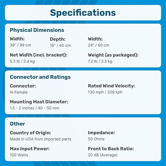 - SAY HELLO TO GRIDDY! - Ultra-wideband yet super high gain. Griddy has 12-17 dBi of gain on the 600-960 MHz frequency bands; 20-23 dBi of gain on the 1700-2700 MHz frequency bands; and 23-26 dBi of gain on 3000-6500 MHz frequency bands.