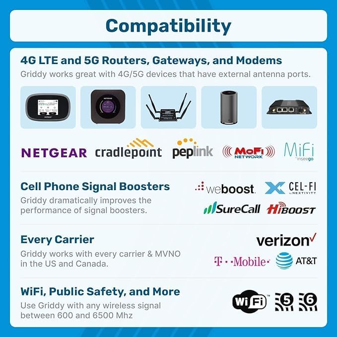 - GRIDDY SUPPORTS 4G LTE, 5G NR, and WIFI: Griddy connects to the antenna ports on your hotspot, router, or WiFi device to give you extra signal. Griddy comes with 50 Ohm N-Type connectors. You’ll need to connect this antenna to a signal booster, LTE router, or WiFI access point with their respective adapters.