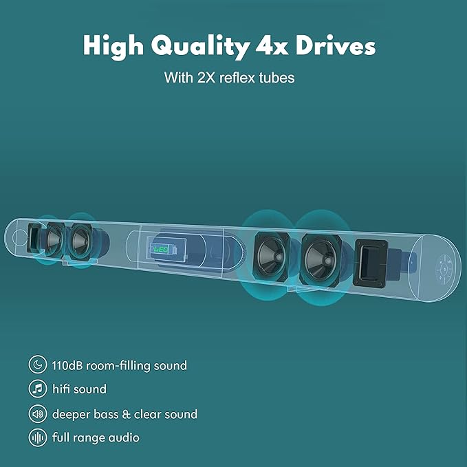 - Enjoy 110 dB of room-filling sound, featuring 4x 20W powerful full-range speakers and 2x bass reflex tubes, delivering crystal clear sound and deep bass for all your movies, music, news, and gaming needs, perfect for any room in your home.