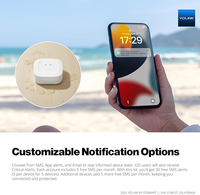 - Customizable Notification Options: Choose from SMS, App alerts, and Email to stay informed about leaks. iOS users will also receive Critical Alerts. Each account includes 5 free SMS per month. With this kit, you’ll get 30 free SMS alerts (5 per device for 5 devices). Additional devices add 5 more free SMS per month, keeping you connected and protected.