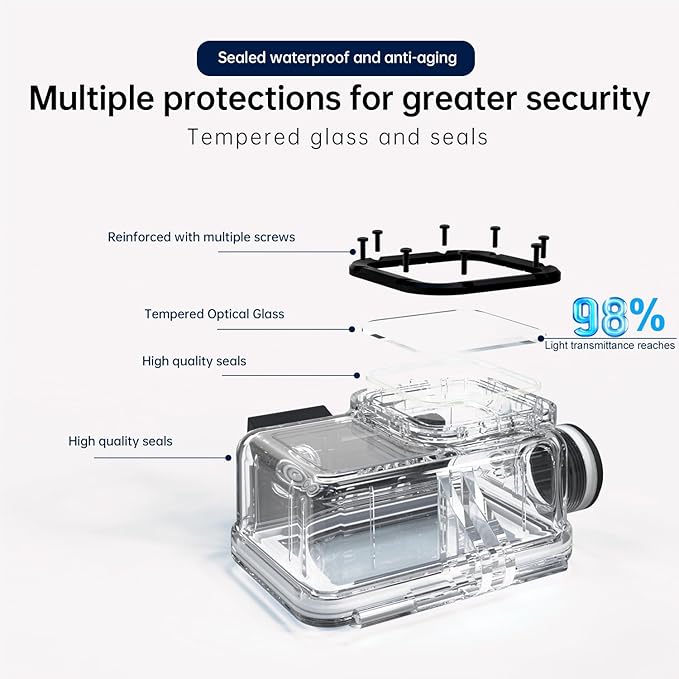 - Ultra durable the use of stainless steel production, you can dive into the sea do not have to worry about rust. Toughened glass in front of the camera, you can make your camera better light transmittance, Shoot more real, more beautiful pictures.