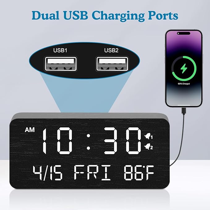 - Special Feature : Date and Temperature Display, Dual USB Charging Ports, Wireless Charging Station, 5 Levels Brightness and Volume, Dual Alarm Clock with Snooze, Manual DST, Stylish Wood Grain Surface, etc. Date and Temperature Display, Dual USB Charging Ports, Wireless Charging Station, 5 Levels Brightness and Volume, Dual Alarm Clock with Snooze, Manual DST, Stylish Wood… See more