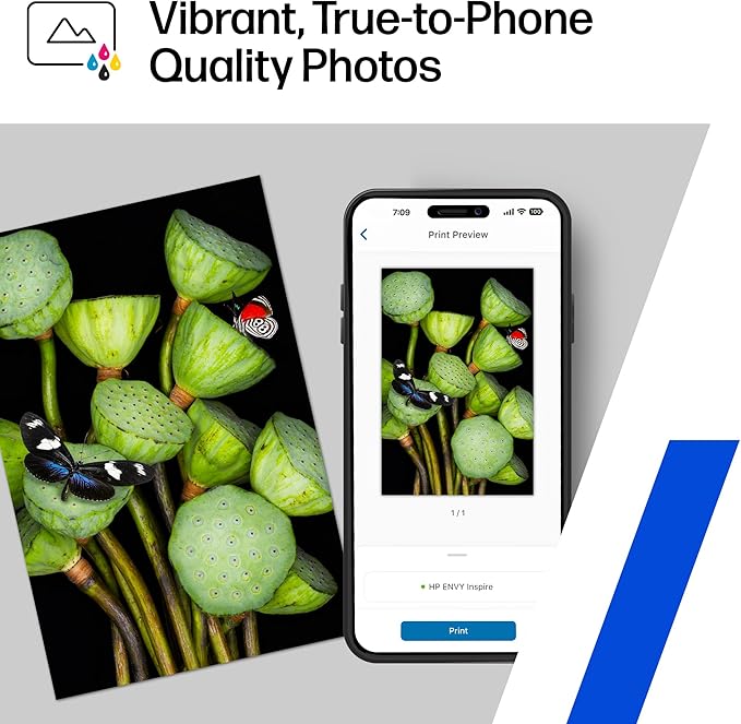 - VIBRANT PHOTOS – Photos that look as vibrant as they do on your screen with true-to-phone quality prints, plus custom photo features in the HP Smart app. HP 5x5" square and 4x12" panoramic photo paper sizes are optimized for the HP ENVY Inspire series