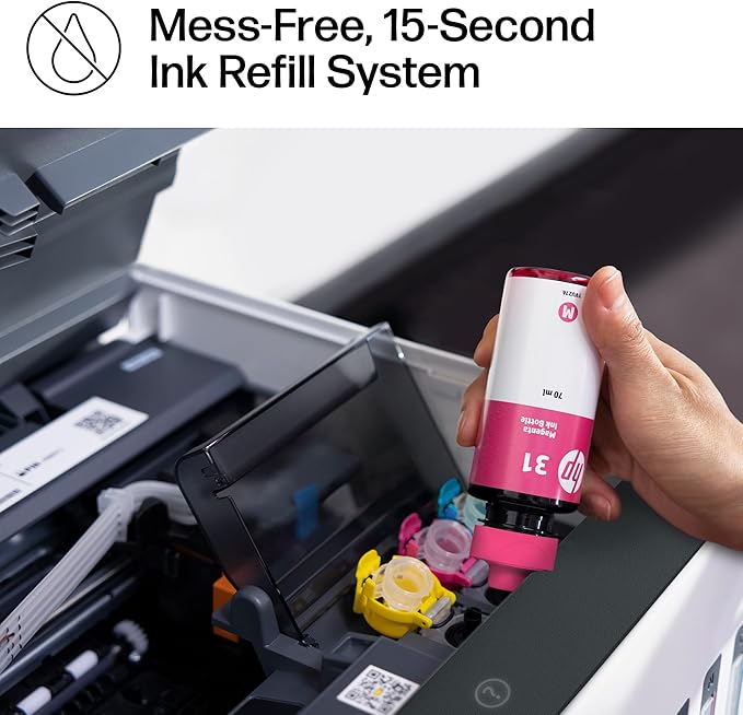 - MESS-FREE REFILL – Replenish ink with HP's easy-access, mess-free refill system. Simply plug the ink bottles into the ink tank and let them drain—no squeezing, no spilling