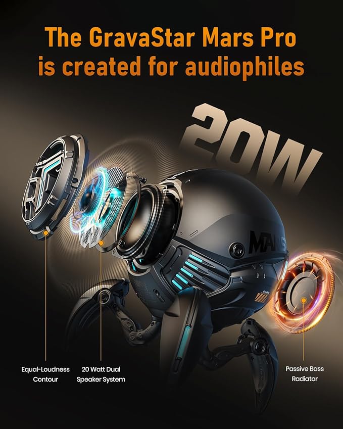 - 【CRAFTED DESIGN, CRAFTED SOUND】The GravaStar Mars Pro is created for music lover. The Bluetooth speaker has built-in, exclusive DSP audio algorithms that give you a deep bass, accurate mids, and crisp highs. Combined with an equal-loudness contour, you get a powerful sound experience.