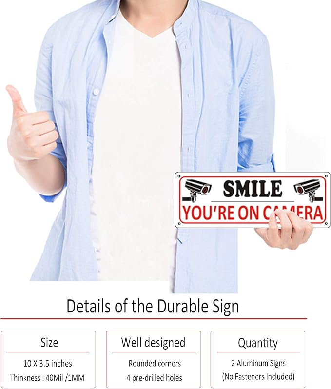 - 【DURABLE ALUMINUM】 This 10 x 3.5 inches You're on Camera sign is made of heavy-duty 40 mil thick aluminum, which is rust-free and durable enough for indoor and all-weather outdoor uses. So you can use this Smile You're on Camera sign metal for home/ business/ fence/ yard/ front door or any other places you want.